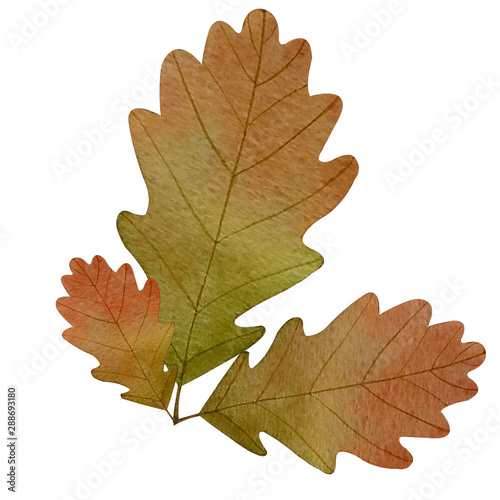 Autumn oak leaves isolated on white background. Watercolor drawing