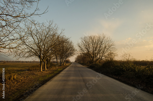 Autumn or winter landscape with road and trees. The gold light beams sunset. On a background of mountains and the sky with clouds. Azerbaijan Caucasus