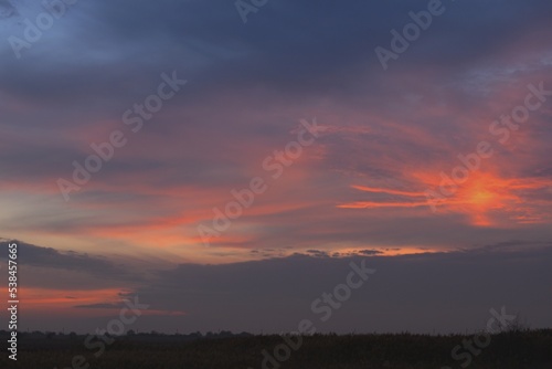 Autumn pink sunset, beautiful high sky, evening landscape of an endless field, Krasnodar region, Russia