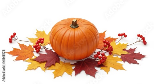 Autumn Pumpkin Decoration With Maple Leaves and Red Berries