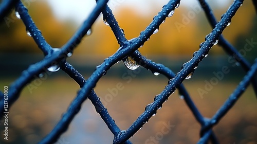 Autumn rain on park fence, blurred background