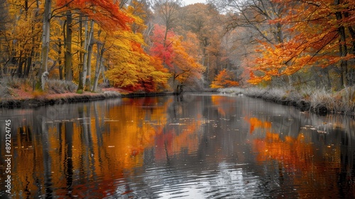 Autumn riverbank with colorful trees, reflections in water, tranquil scene, seasonal change, nature at its best, copy space.