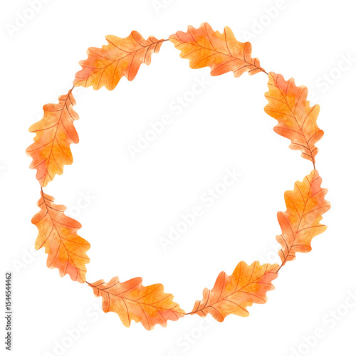 Autumn round frame with watercolor leaves on a white background. Plants arranged in a circle. Hand drawn illustration for your design, print, textile