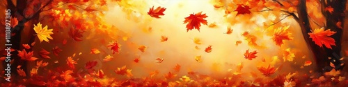 Autumn Scene with Swirling Maple Leaves in Vibrant Colors Blown by the Wind
