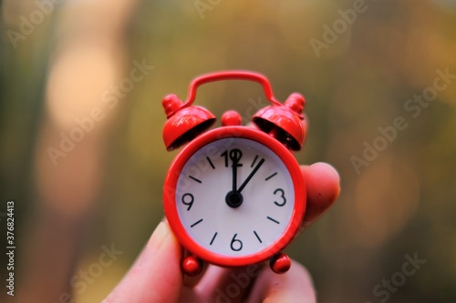 Autumn season .Autumn time. alarm clock in hand on blurred autumn yellow forest background.Symbol of the beginning of the autumn season. Autumn mood