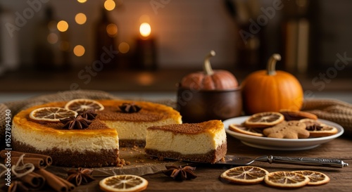 Autumn Spice Cheesecake Delight - Cozy autumn vibes with a sweet treat. A delicious cheesecake, spiced with cinnamon and star anise, garnished with candied orange slices. Symbolizing warmth, comfort