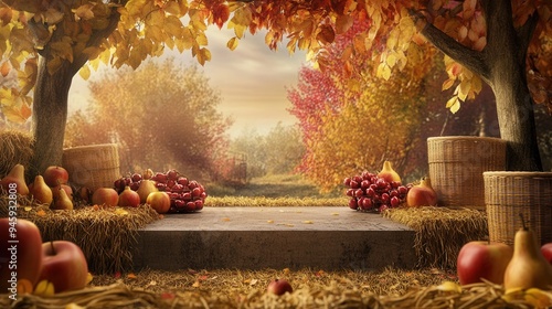 Autumn Stage Mock-Up with Podium, Harvest Elements, and Changing Leaves in a Serene Setting. AI generated illustration