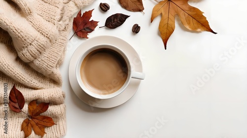 Autumn still life with a coffee cup, hat, dried leaves, and a beige sweater on a white surface. Flat lay arrangement from above with space for text