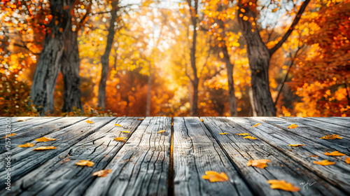 Autumn Tableau: Empty Wooden Table in a Sunny Forest, Seasonal Display with Fall Foliage, Vintage Feel
