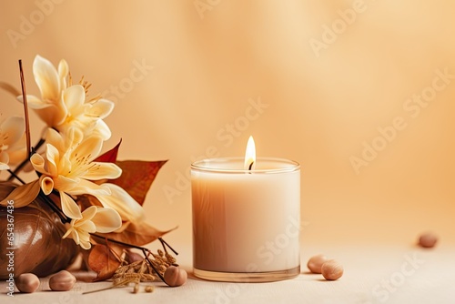 Autumn themed interior with vanilla candle foliage and flowers creating a cozy and relaxing atmosphere