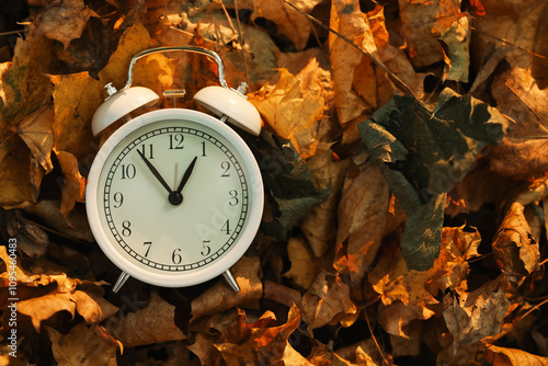 Autumn time. Alarm clock on fallen leaves outdoors, top view with space for text
