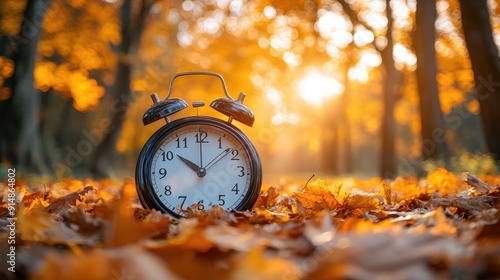 Autumn Time Change Concept: Alarm Clock on Forest Ground with Golden Sunlight and Fall Leaves – Copy Space for Text