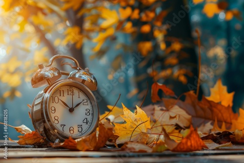 Autumn time change with fall leaves, alarm clock, daylight saving time in high quality image