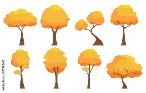 Autumn tree set. Collection of tree isolated on a white background. Each species of trees. A tree with orange leaves. Nature or healthy lifestyle topics. Vector illustration flat design style