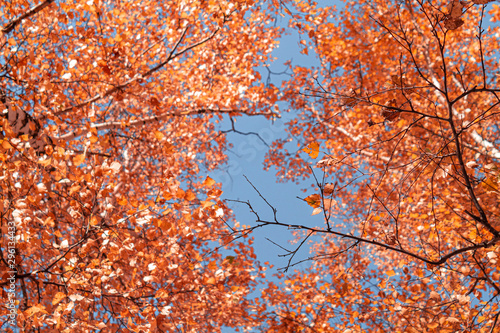 Autumn yellow leaves on branches against blue sky. bottom view.