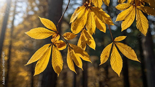 Autumn yellow leaves swirling in the wind against the backdrop of a fall forest on a sunny afternoon