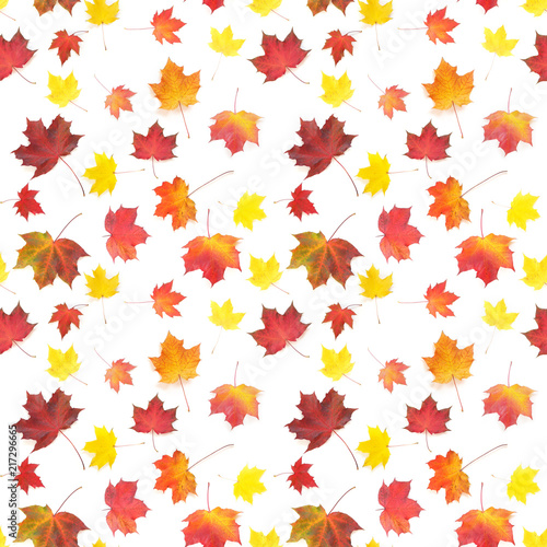 Autumn yellow, orange and red maple leaves isolated on white background, top view, flat layout. Creative seamless pattern. Autumn background.