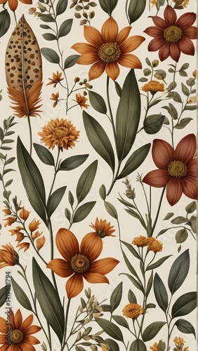 Autumnal floral pattern with rust and beige flowers and leaves. Warm, botanical design perfect for backgrounds or fall themes.