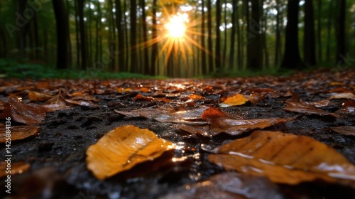 Autumnal forest path bathed in golden sunlight. Fallen leaves carpet the ground, reflecting the warm glow of the setting sun