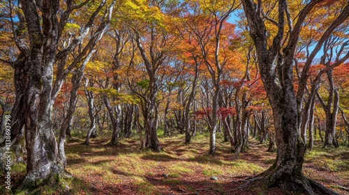 Autumnal forest scene with colorful foliage and fallen leaves.