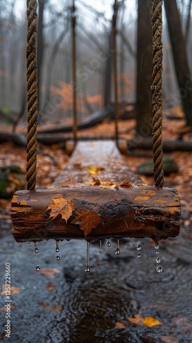 Autumnal Forest Swinging Log Bridge Rain Leaves Water Drops