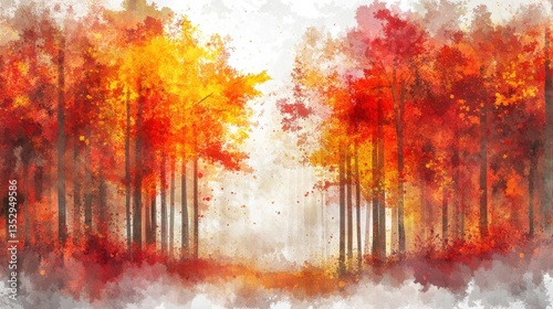 Autumnal Forest Watercolor Painting with Red and Orange Leaves