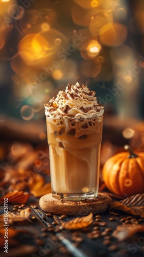 Autumnal Iced Pumpkin Spice Latte in a glass, topped with whipped cream and sprinkled with cocoa.
