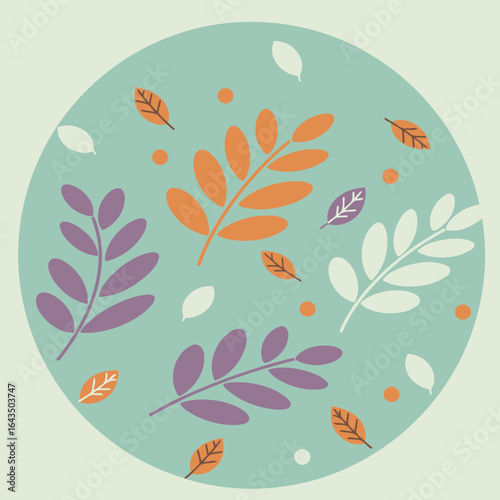Autumnal leaf design with a circle background in muted colors. Abstract, graphic representation of leaves and branches, creating a seasonal, nature-inspired pattern.
