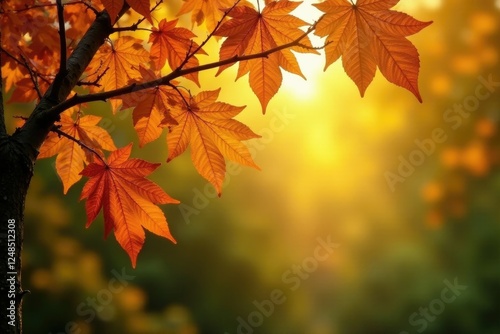 Autumnal leaves and branches in a warm golden light, golden hues, tree foliage, leafy greens