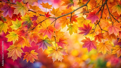 Autumnal Maple Leaves Displaying Vibrant Hues of Red, Orange, and Yellow on a Branch