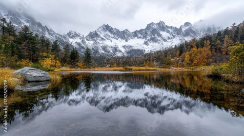 Autumnal Mountain Lake Reflection, Calm Water, Colorful Trees, Snowy Peaks