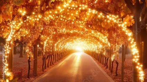 Autumnal pathway, illuminated by warm lights, creating magical tunnel