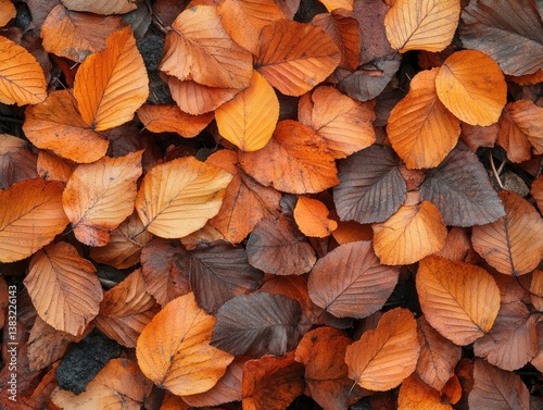 Autumnal symphony of fallen beech leaves in vibrant hues creating a textured carpet from above capturing the essence of fall season