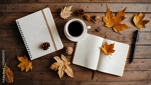 Autumn-Inspired Cozy Workspace with Coffee and Notebook – Flat Lay