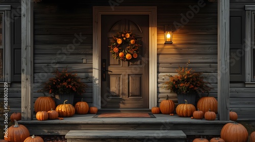 Autumn-themed porch at dusk with pumpkins and fall foliage