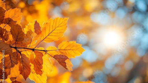 Autumn-themed Thanksgiving header with yellow maple leaves, sunlight, and a clear blue sky in the background