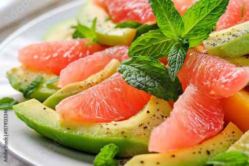 Avocado and Grapefruit Salad with Mint, fresh avocado slices layered with juicy grapefruit segments, fresh mint leaves, and a citrusy vinaigrette.