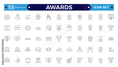 Awards and Bonuses outline icons set. Vector illustration in modern thin line style of icons, such as Cups, Awards, Medals, Diplomas, Champion, Number One, and Winner. Editable stroke outline icon.