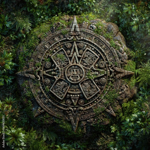 Aztec Calendar Carving in Jungle. Tourism concept. Foliage background. Decoration