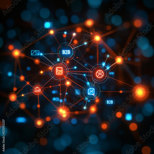 "B2B" in cool blues, with icons of digital connections, business meetings, and contracts exchanged online. Bright lighting, contrast