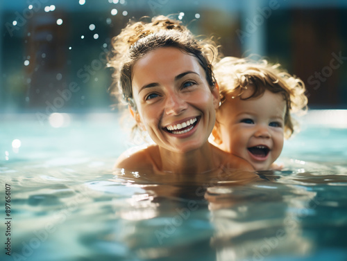 Baby and his mother swimming in an indoor pool during summer, both smiling