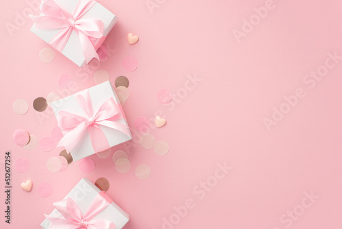 Baby girl concept. Top view photo of white gift boxes with ribbon bows small hearts and shiny confetti on isolated pastel pink background with copyspace