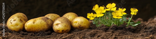 Baby potatoes. Heap of washed potatoes with bunch of yellow rape flowers on clean soil, side view. Soil fertilization concept. Long banner with copy space. Studio photo for advertising.