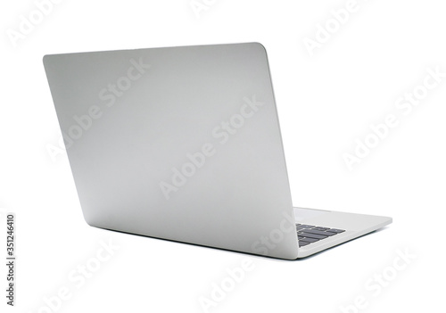 Back left view of Open laptop computer for mockup. Modern thin edge slim design. Gray metal aluminum material body isolated on white background with clipping path.