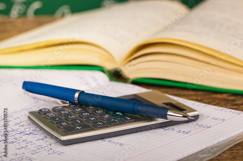 Back to school - blackboard with pencil-box and school equipment on table