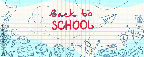 Back to school. Background with doodle supplies. School notebook concept with sketches. Flat design. Vector illustration.