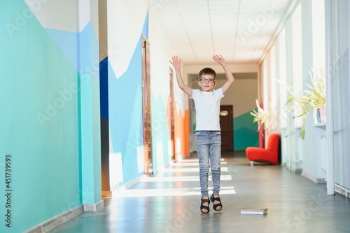 Back to school concept. School child in class. Happy kid against green blackboard. Smart child in classroom. Idea and education concept