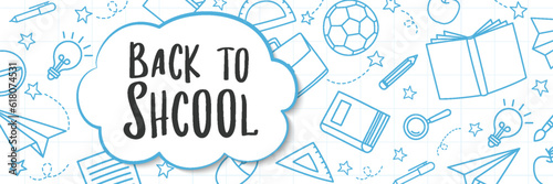 Back to school doodle style background. Education hand drawn objects and symbols banner.