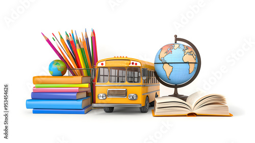 back to school, education and learning concept. school accessories, books and textbooks, school bus, pencils and globe isolated on white background, simple style, png