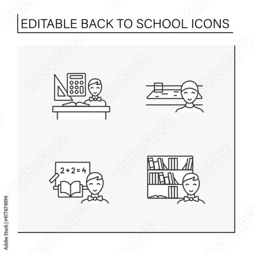 Back to school line icons set. Happy schoolboy ready to study. Math lesson, swimming pool, counting on blackboard and library. Education concept. Isolated vector illustrations. Editable stroke
